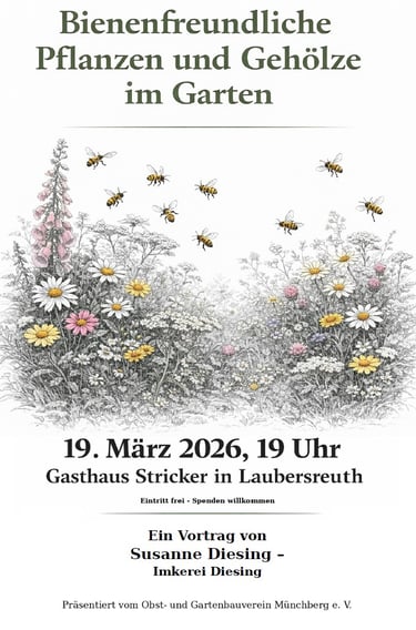 In der gleichen Örtlichkeit findet eine Woche später, am 19. März 2026, ein weiterer Vortrag statt. Susanne Diesing von der Imkerei Diesing aus Mechlenreuth informiert über bienenfreundliche Pflanzen und Gehölze im Garten.