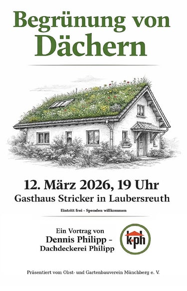 Am Donnerstag, den 12. März 2026, hält Dennis Philipp von der Dachdeckerei Philipp einen Vortrag über das Begrünen von Dächern. Beginn ist um 19 Uhr im Gasthaus Stricker in Laubersreuth.